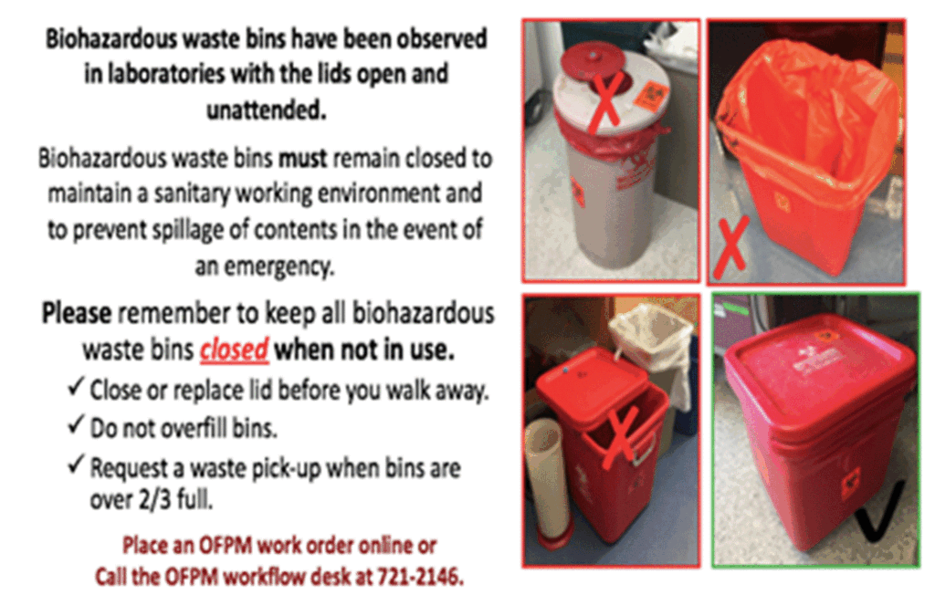 PLEASE SEE BELOW. Some of the most commonly cited items are related to open or improperly labeled medical waste and sharps containers. Please ensure that all biohazard and sharps containers are closed when not in use. This includes the reusable sharps containers as well; the lid should be pushed closed but NOT locked.