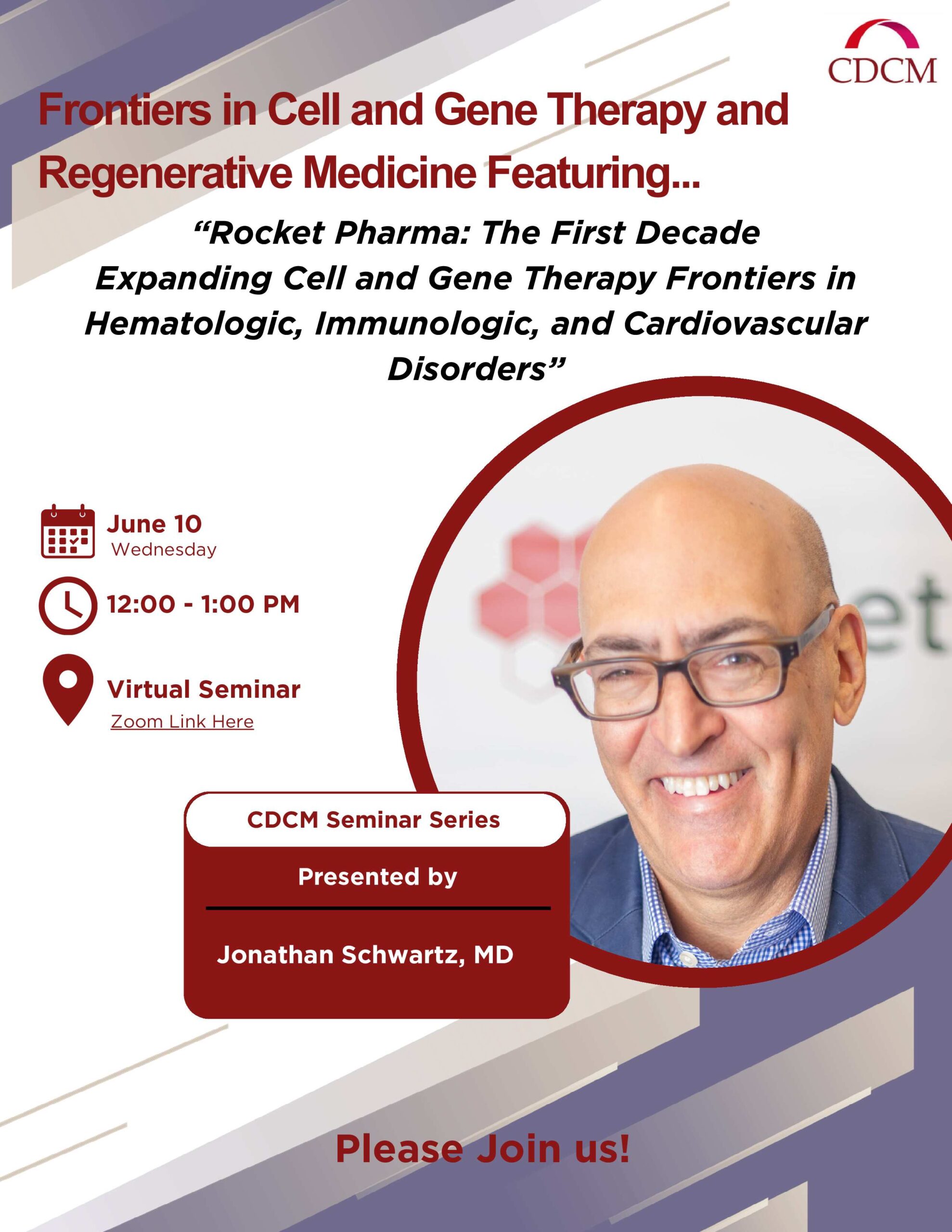 Our next seminar is on June 10th and will feature Jonathan Schwartz, MD (Chief Scientific and Gene Therapy Officer of Rocket Pharmaceuticals). The flyer for the seminar is attached for your convenience.
